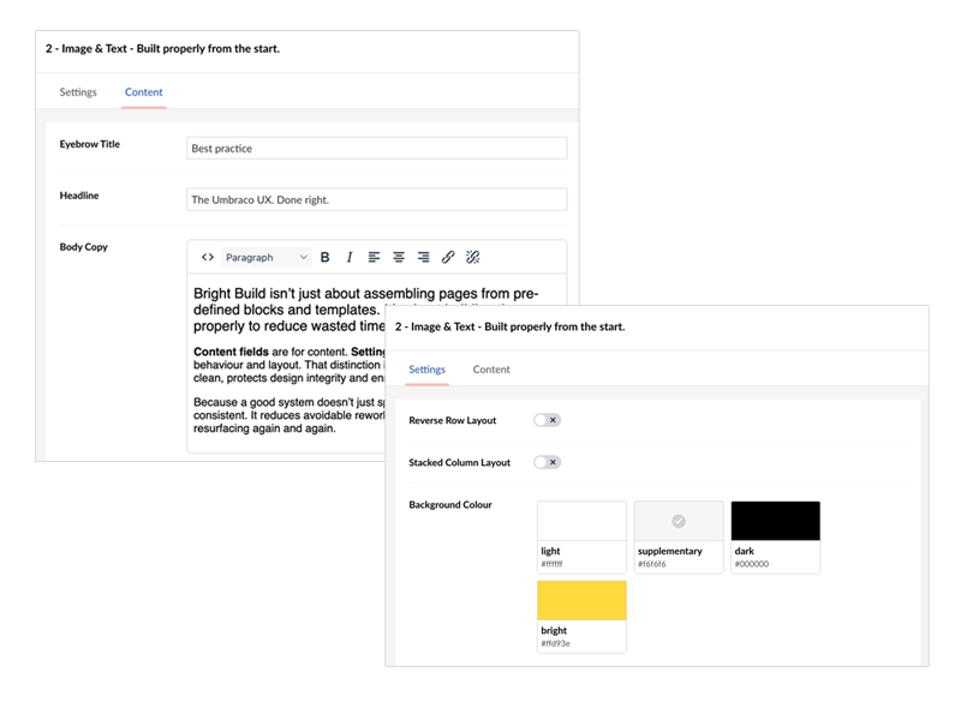 Content fields are for content. Settings fields are for settings, like behaviour and layout. That distinction is deliberate. It keeps structure clean, protects design integrity and ensures consistency at scale.