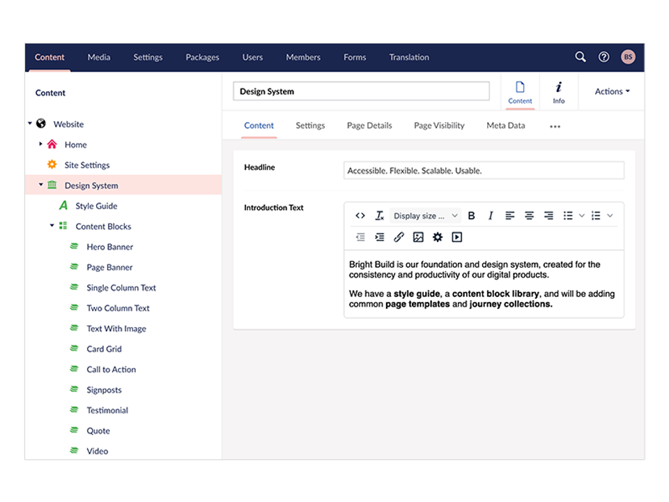 We’ve also decoupled the design system from the website’s content tree, elevating it to sit alongside settings at the root level. That separation matters. It keeps the system independent, controlled and reusable across projects, not tangled inside page hierarchies.