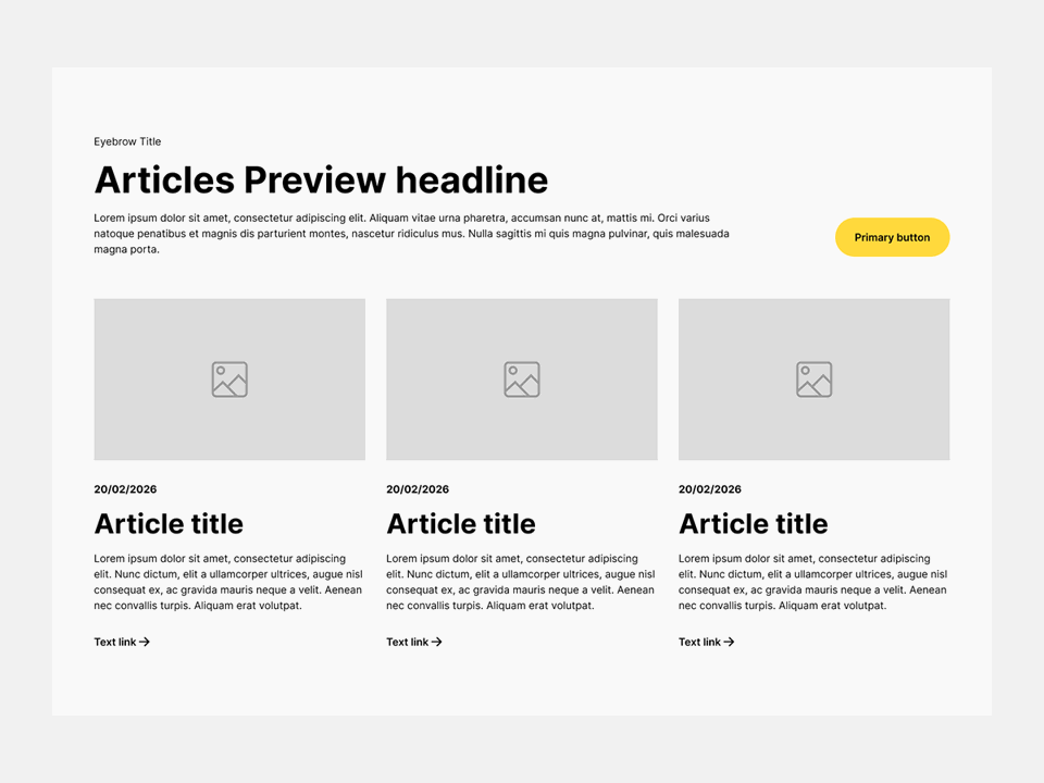 CB-APRW-001 The Article Preview block surfaces recent or featured content in a clear, structured layout. It gives users a quick snapshot of available articles, combining imagery, titles and short summaries to encourage further reading.