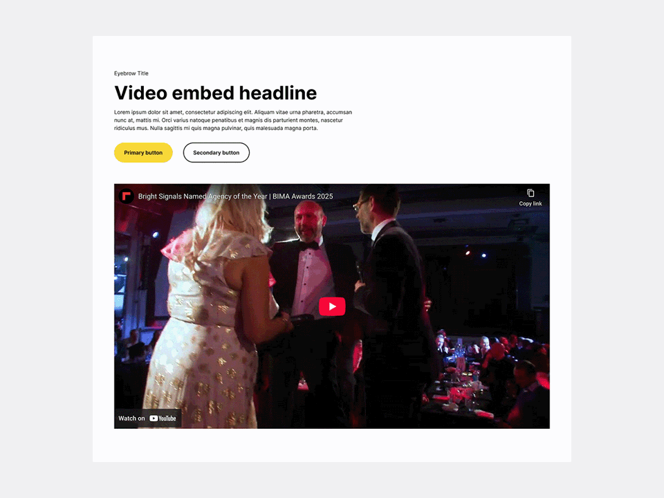 Paired with a headline and optional supporting actions, the video becomes a natural focal point within the page while still fitting neatly into the overall layout.